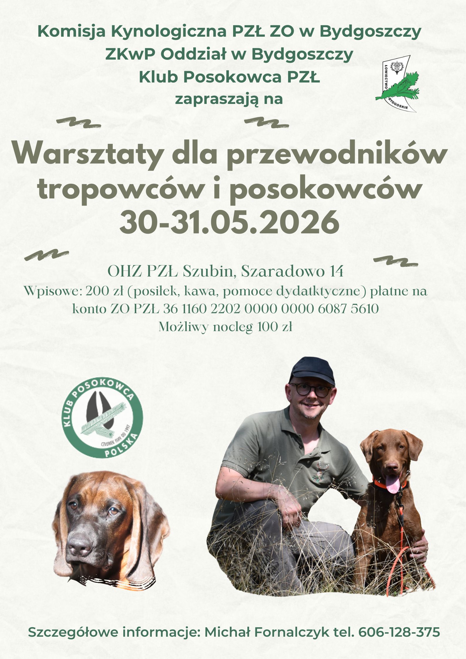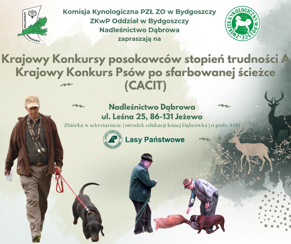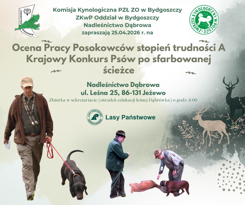 Krajowy Konkursy posokowców stopień trudności A i Krajowy Konkurs Psów po sfarbowanej ścieżce (CACT) odbędą się 25.04.2026 r. w Nadleśnictwie Dąbrowa, ul. Leśna 25, 86-131 Jeżewo.