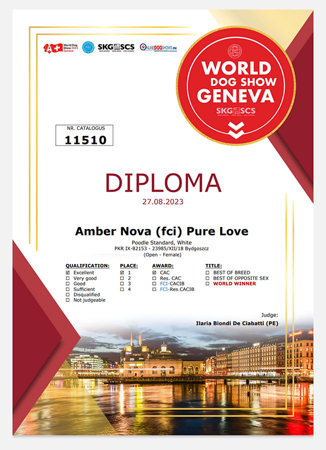 Suka rasy Pudel standard wróciła z oceną 1 ex., CAC, Word winner open white class.